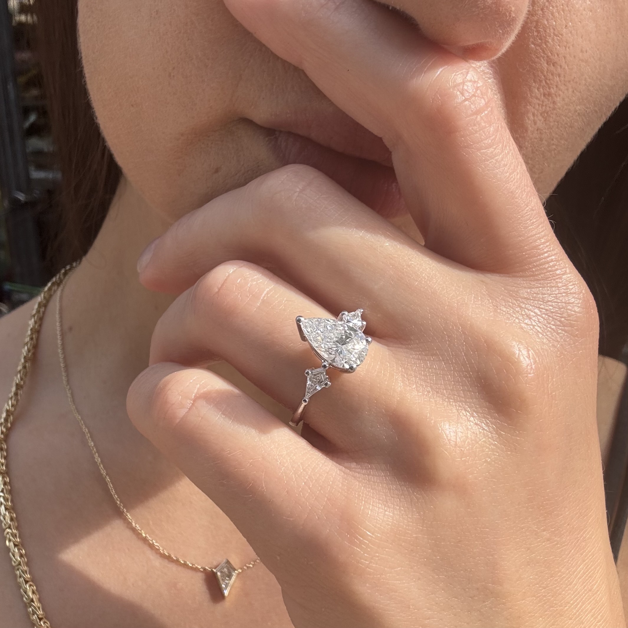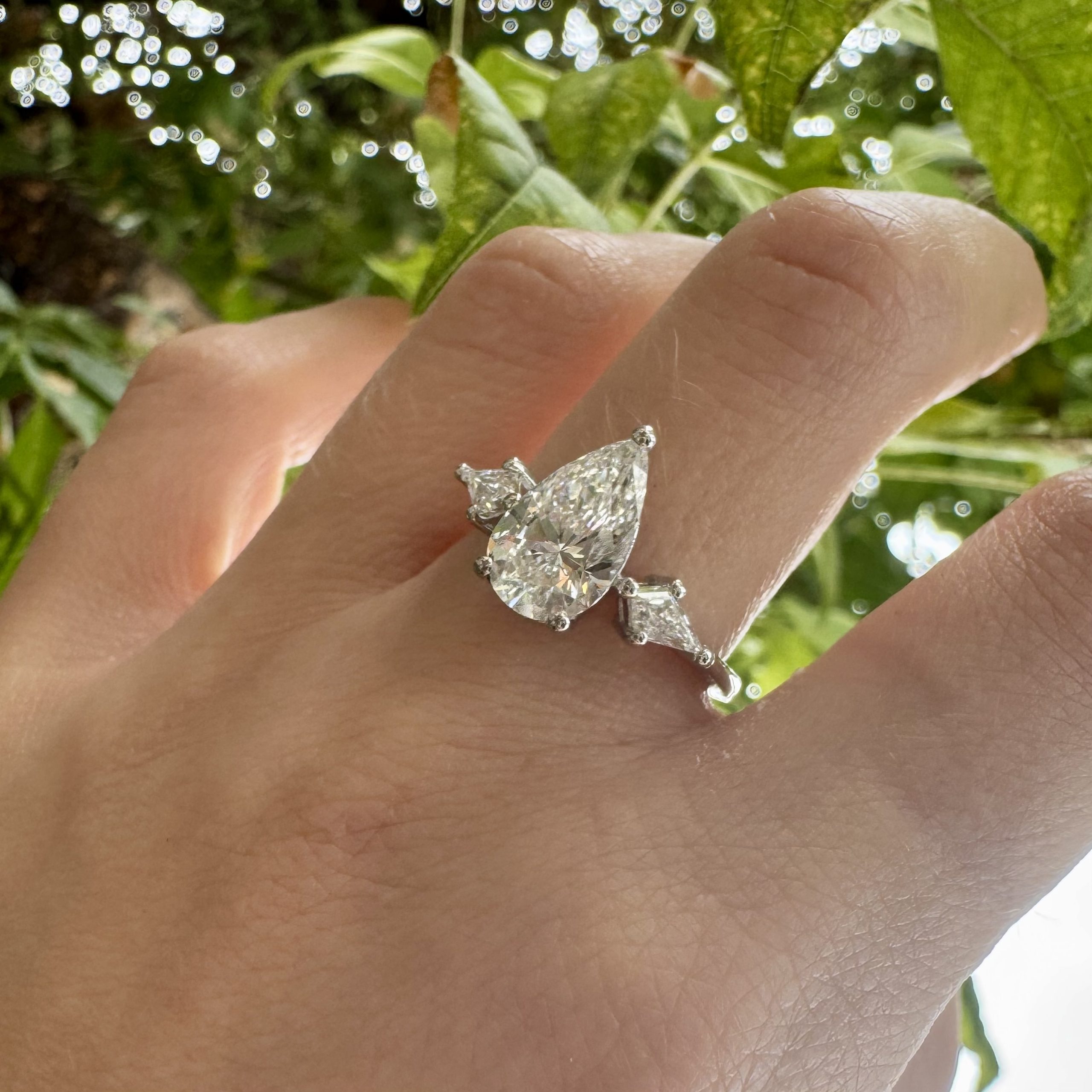 הטבעת משובצת במרכזה ביהלום מעבדה בגודל 2.00 קראט בחיתוך “טיפה”