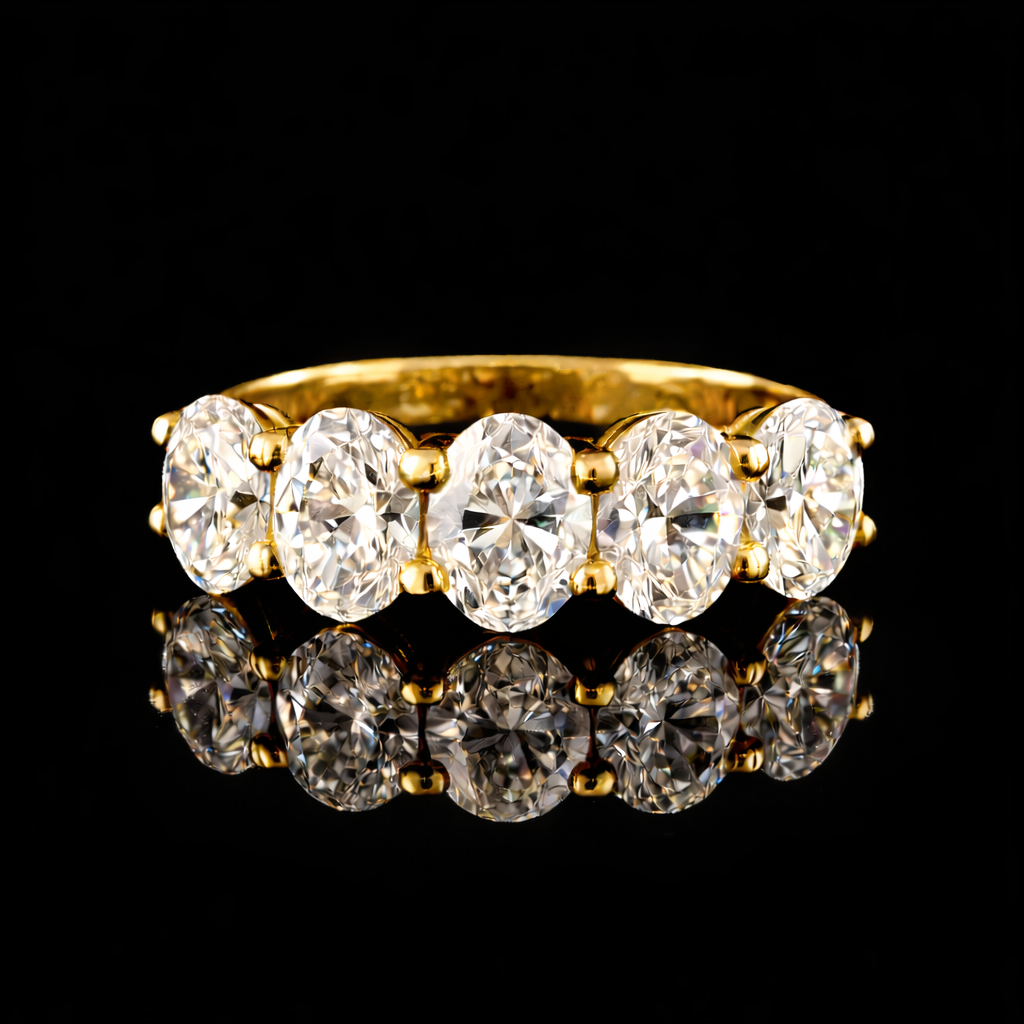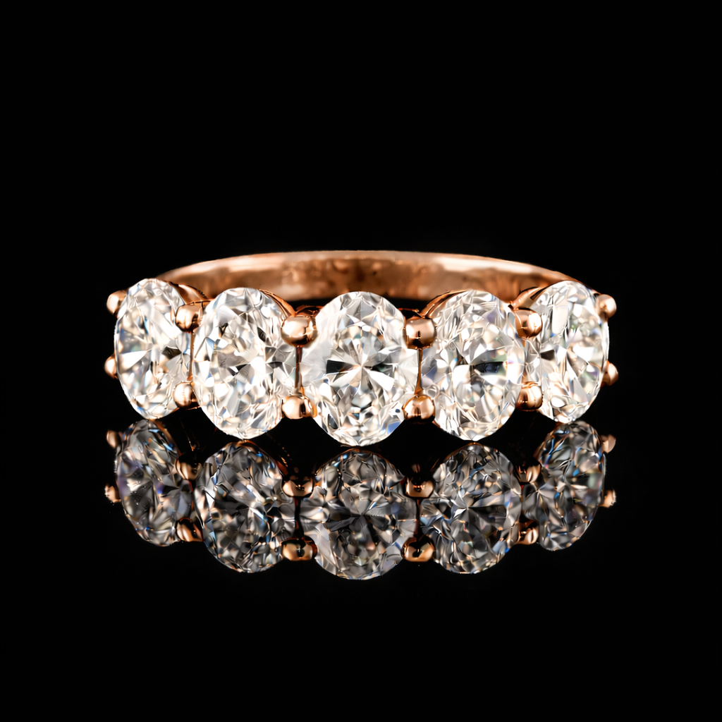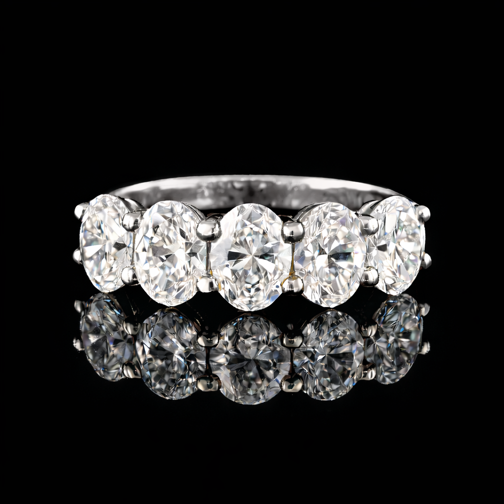 הטבעת משובצת 5 יהלומי מעבדה בצורת “אובל” ברמה הגובהה ביותר ובאיכות הטובה ביותר, גודל היהלומים בטבעת 2.50 קראט