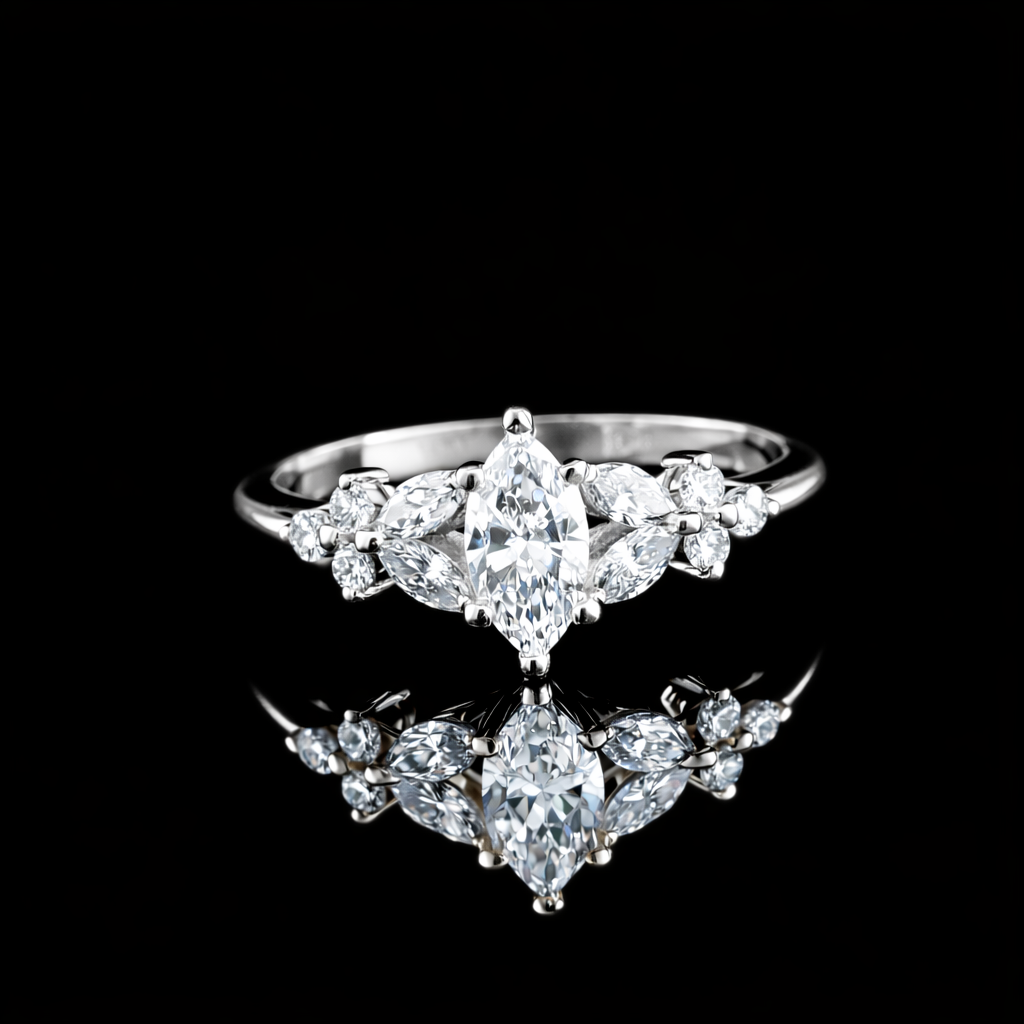 הטבעת משובצת במרכזה ביהלום מעבדה בחיתוך “מרקיזה” בגודל: 0.50 נקודות