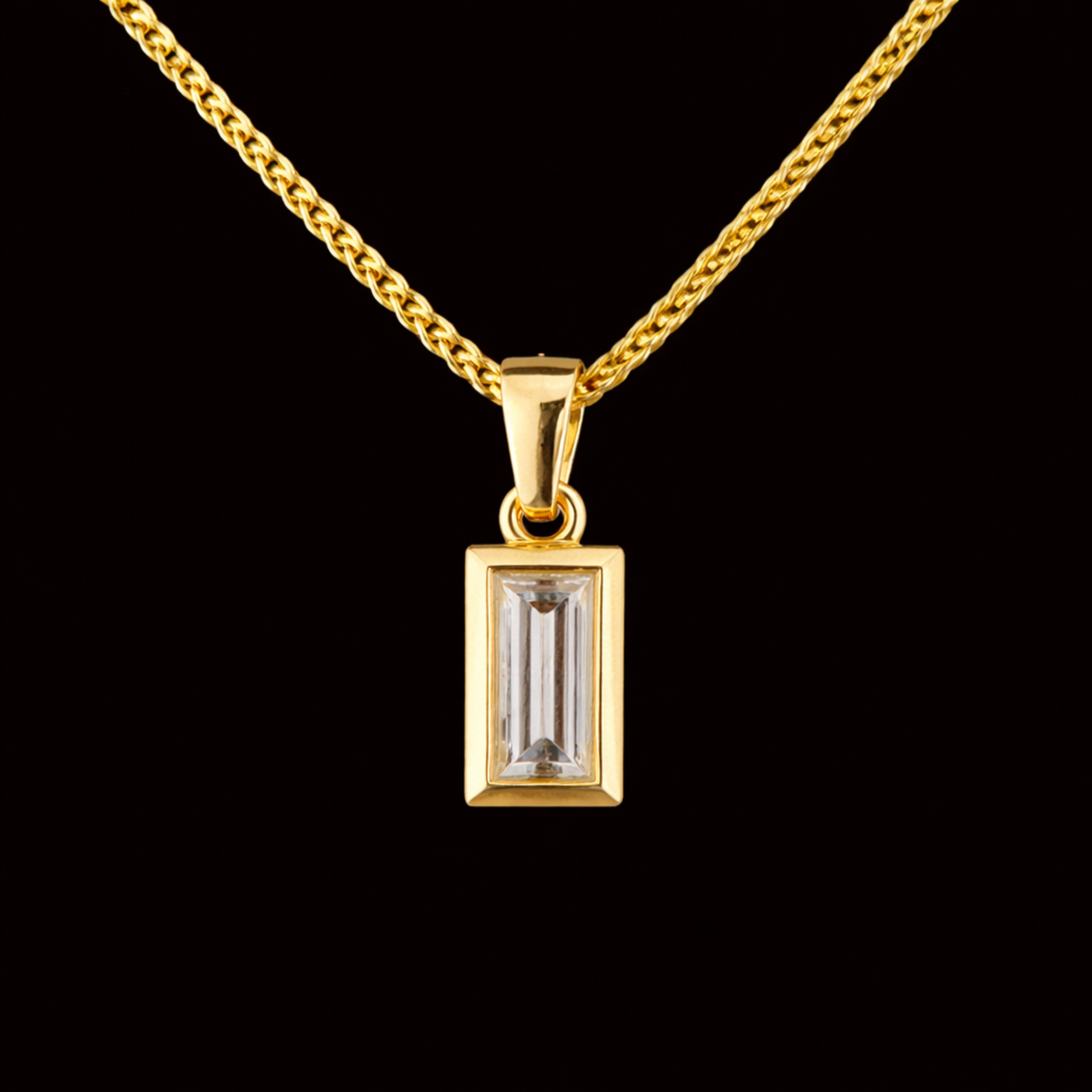 השרשרת משובצת יהלום מעבדה ברמה הגובהה ביותר ובאיכות הטובה ביותר, בחיתוך “באגט” בגודל: 0.60 נקודות.