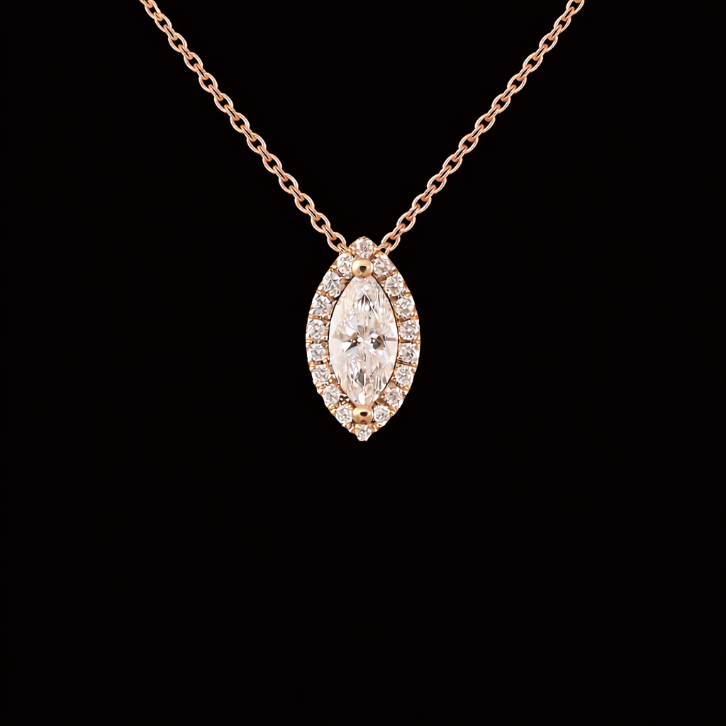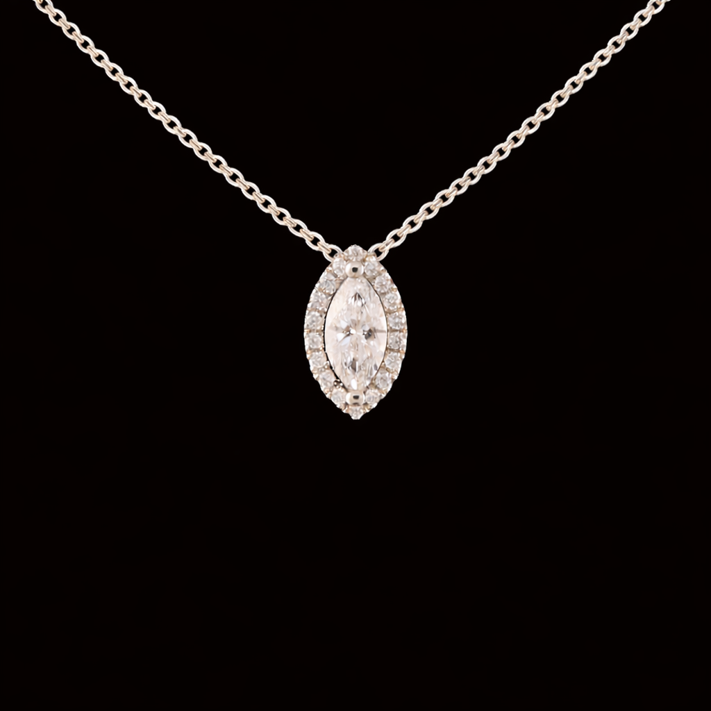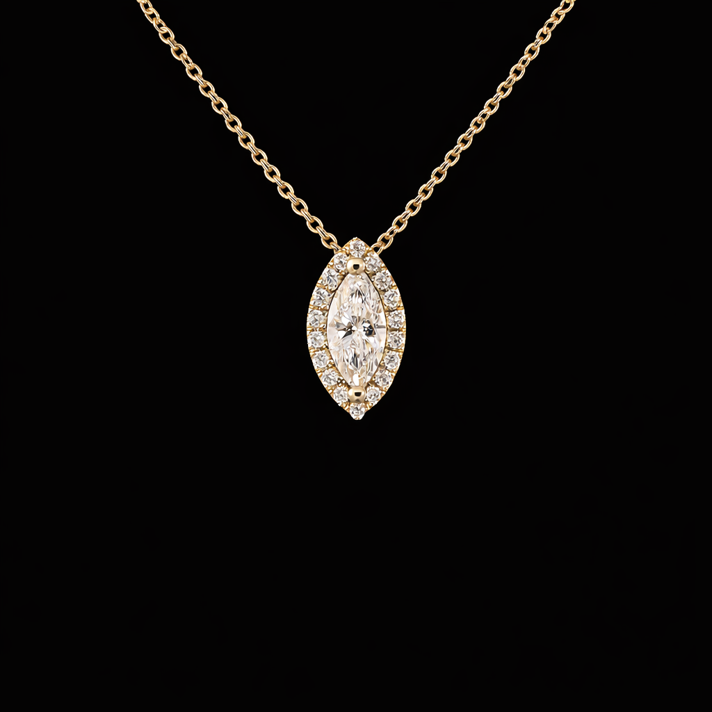 השרשרת משובצת יהלום מעבדה ברמה הגובהה ביותר ובאיכות הטובה ביותר, בחיתוך “מרקיזה” בגודל: 0.50 נקודות.