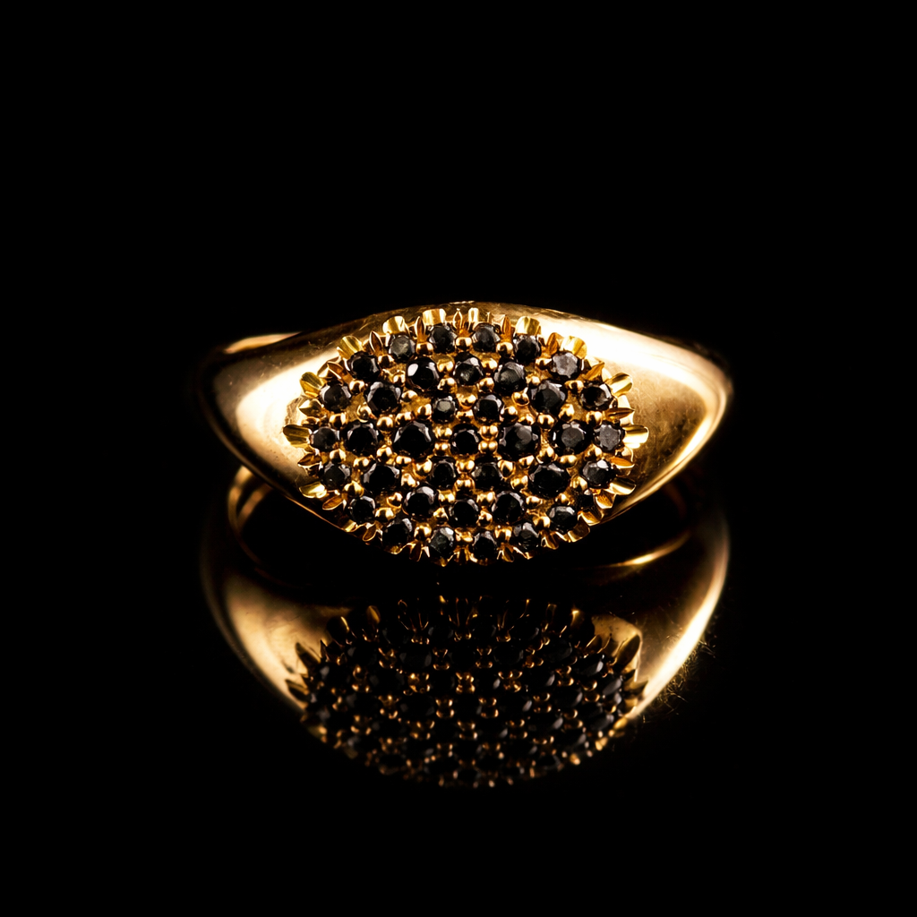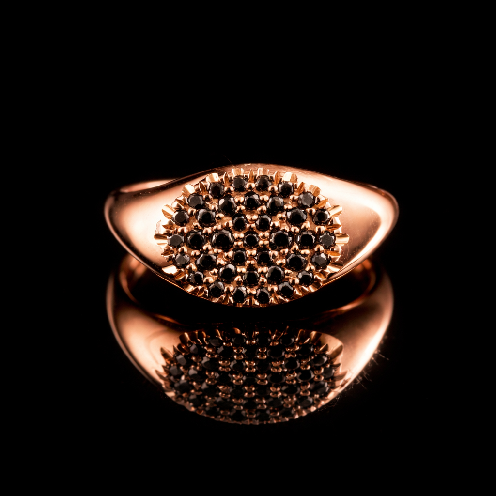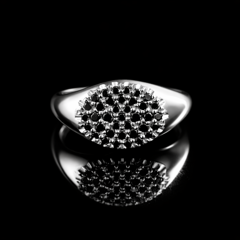 טבעת חותם עדינה ומטריפה משובצת יהלומים שחורים עדינים